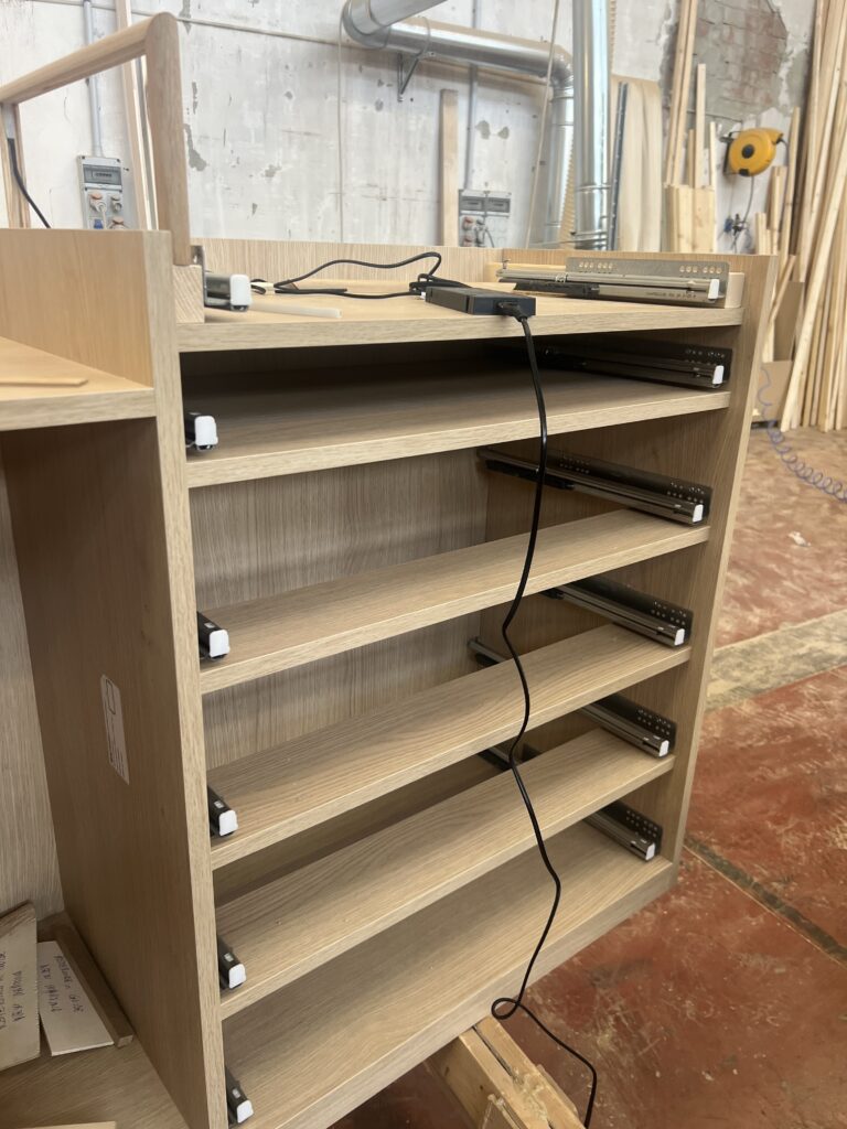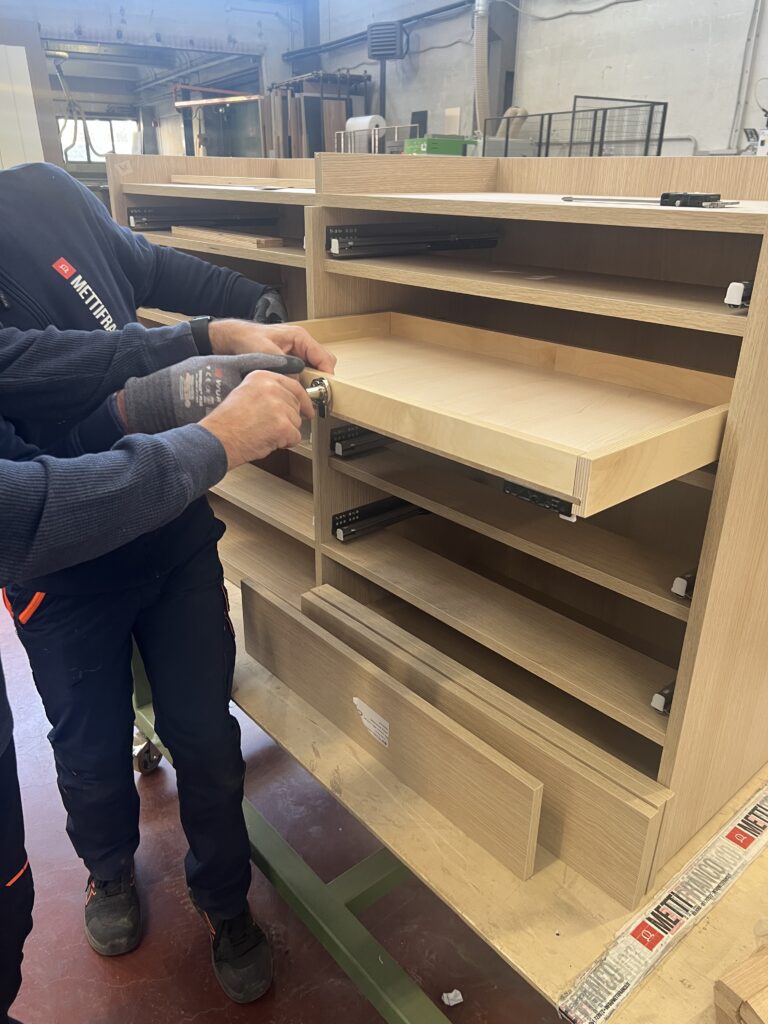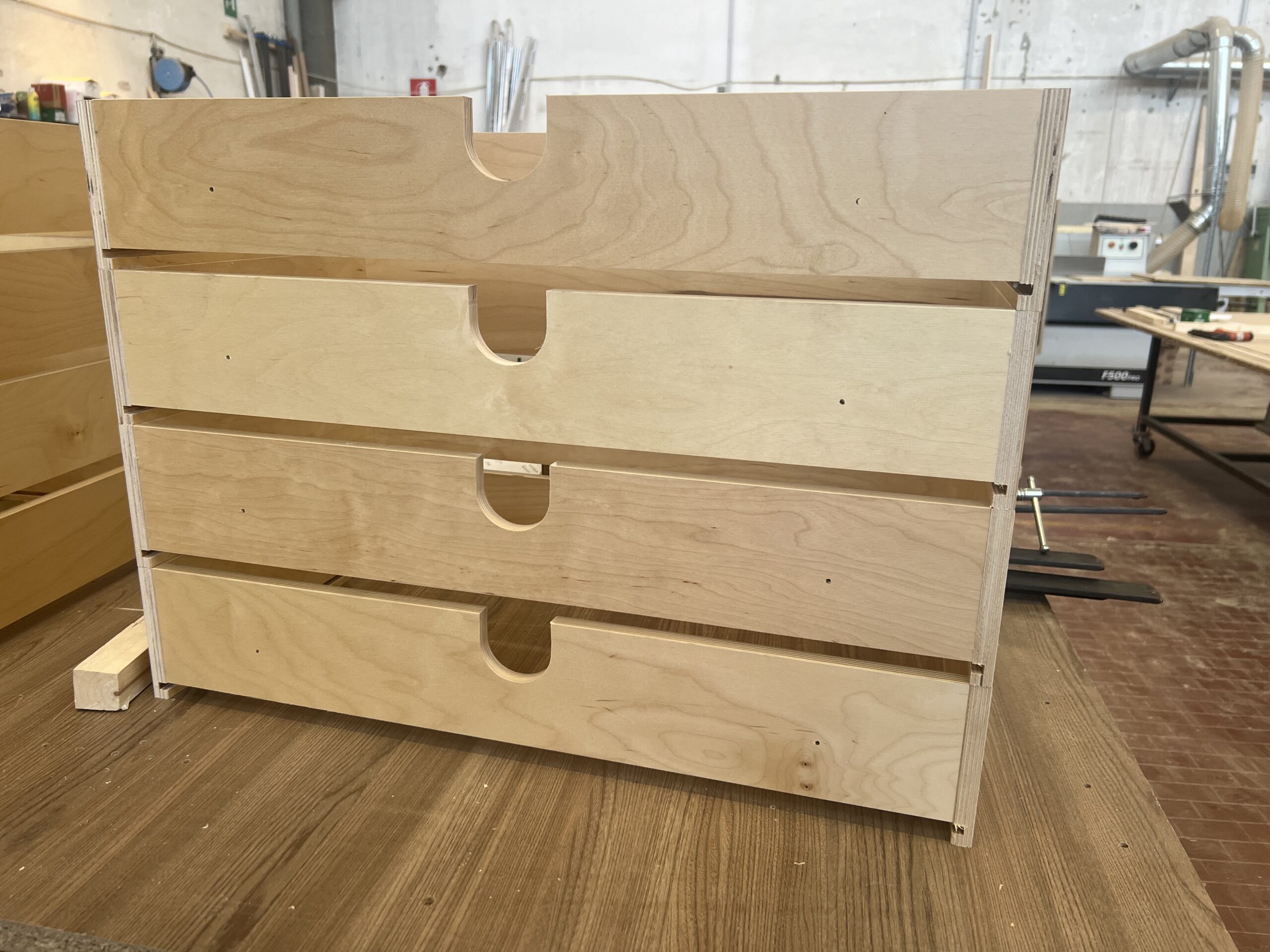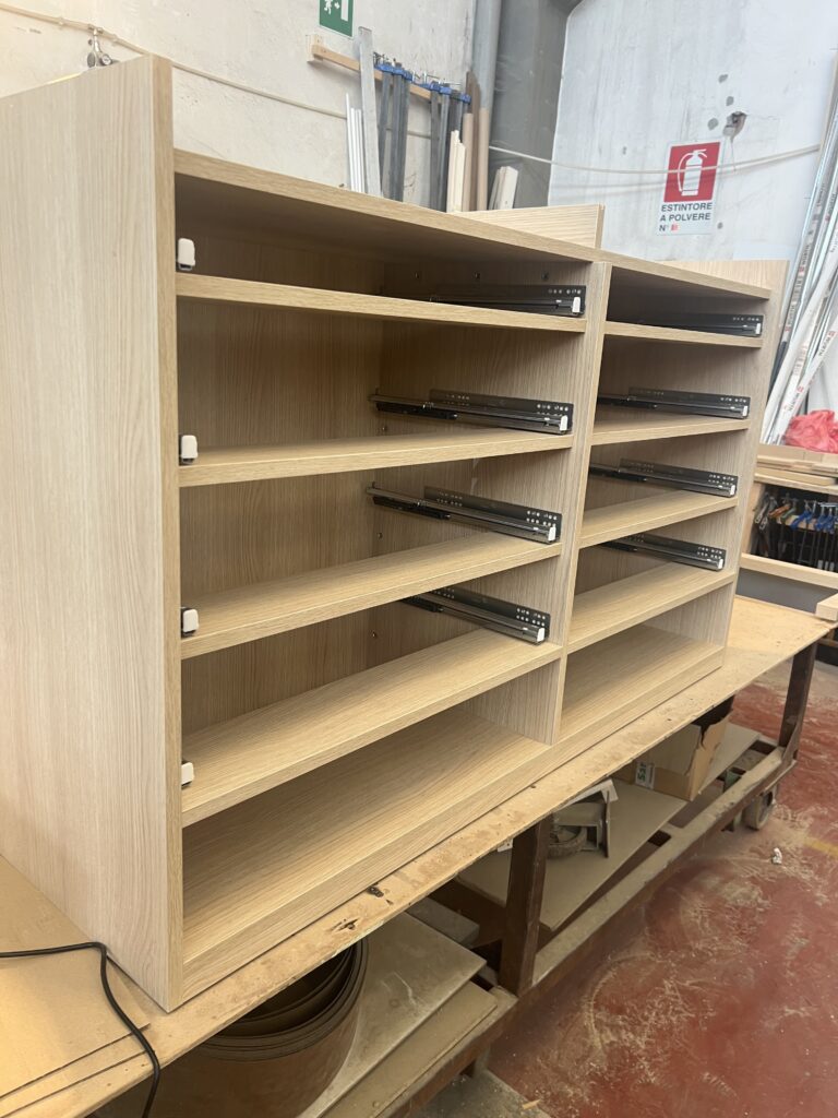 Esempio di banchi per un negozio con cassettiere: eccole in costruzione